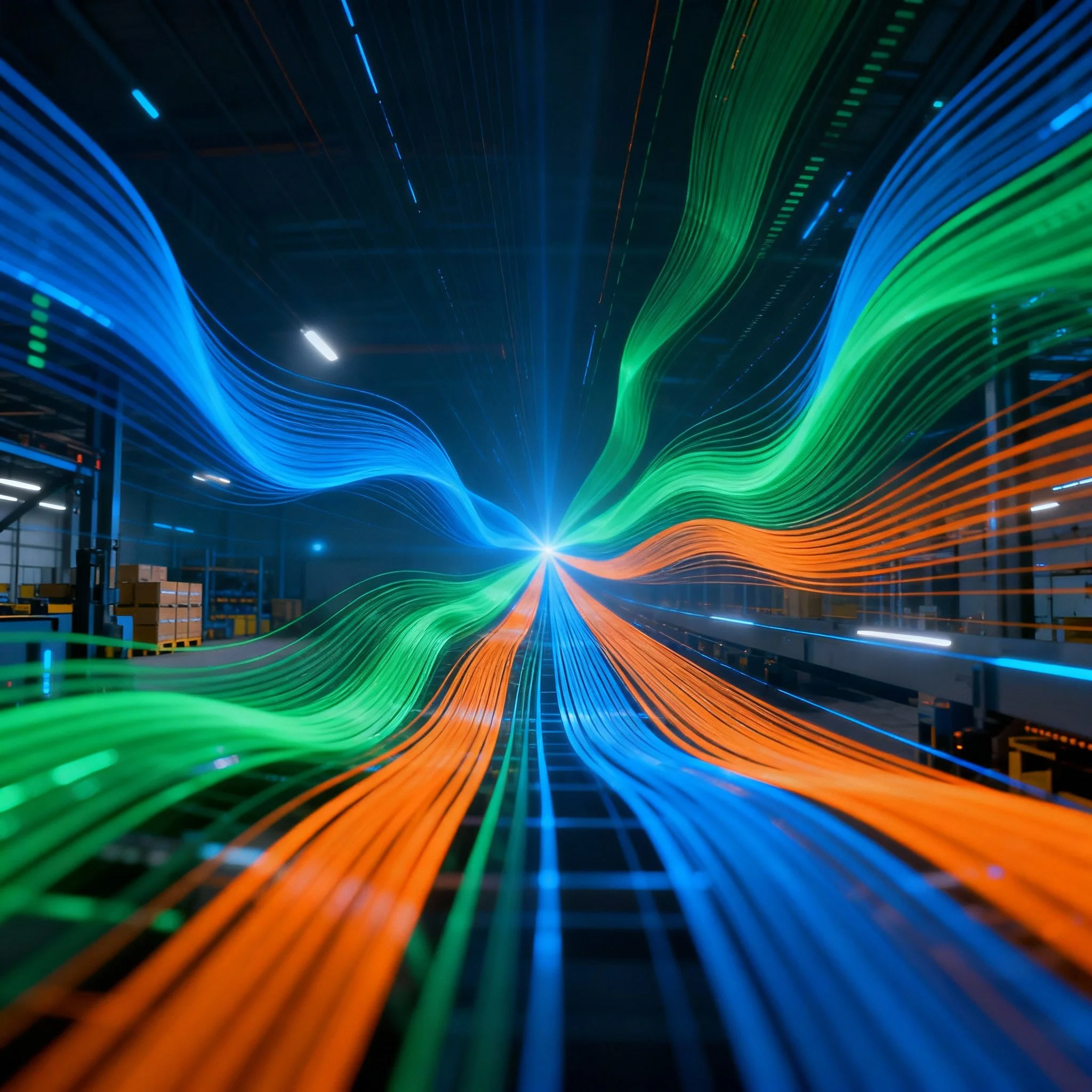 Visualizing data flow and integration in a modern warehouse, symbolizing smart manufacturing and real-time business intelligence.